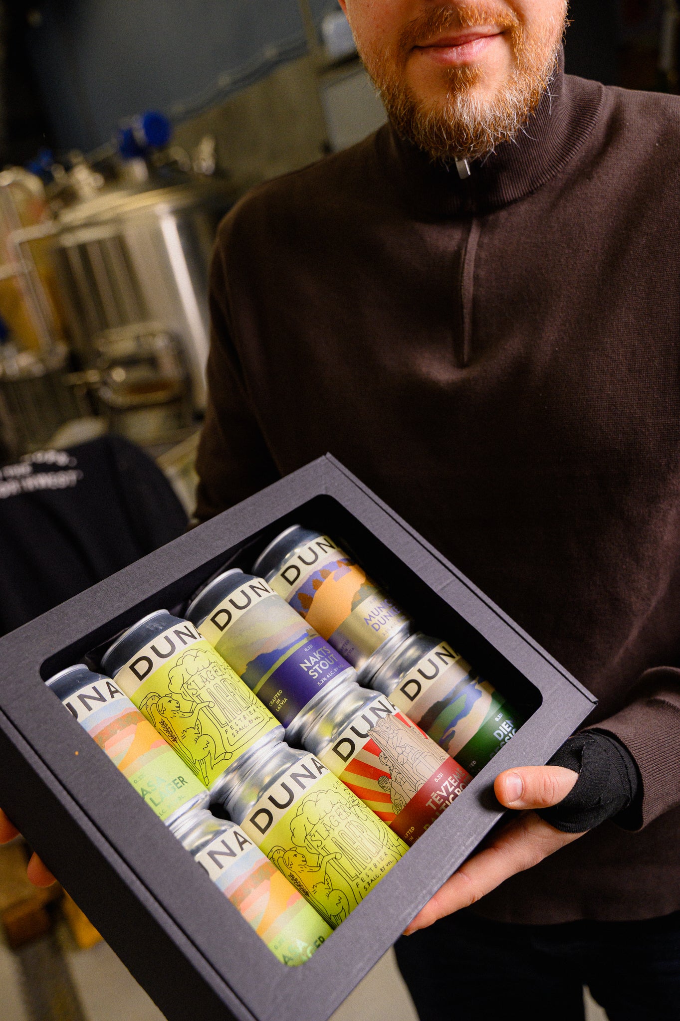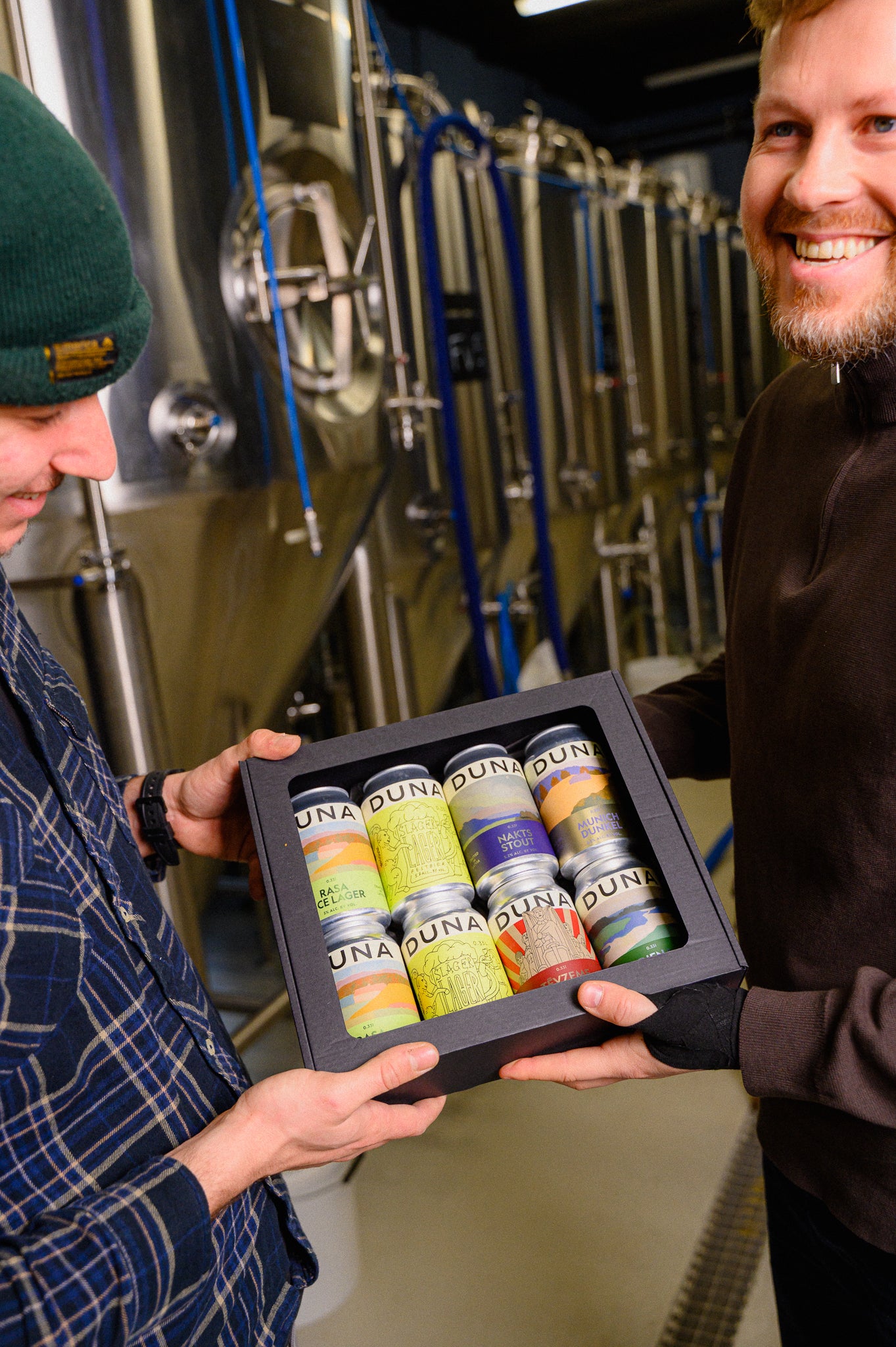 Komplekts parāda DUNA sortimenta pilno spektru — no viegla lagera līdz aromātiskam IPA un dabīgām limonādēm.