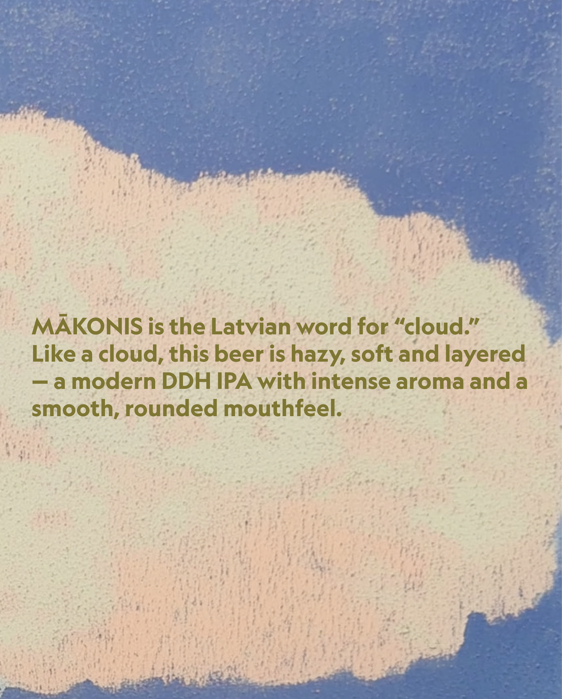 The name MĀKONIS, meaning “cloud” in Latvian, reflects the beer’s hazy appearance and smooth, floating character — a modern DDH IPA built for aroma-driven craft beer lovers.